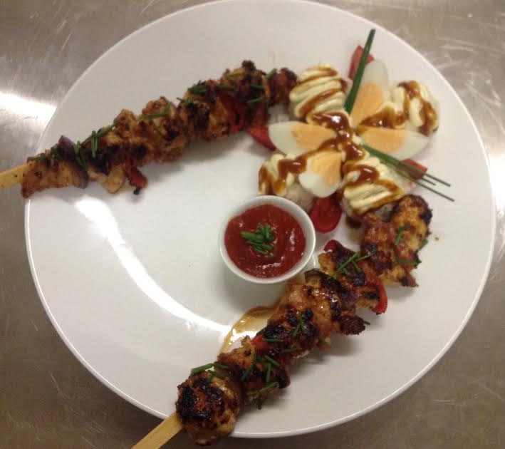 Malse kip Shaslicks met saus, frietjes en salade.