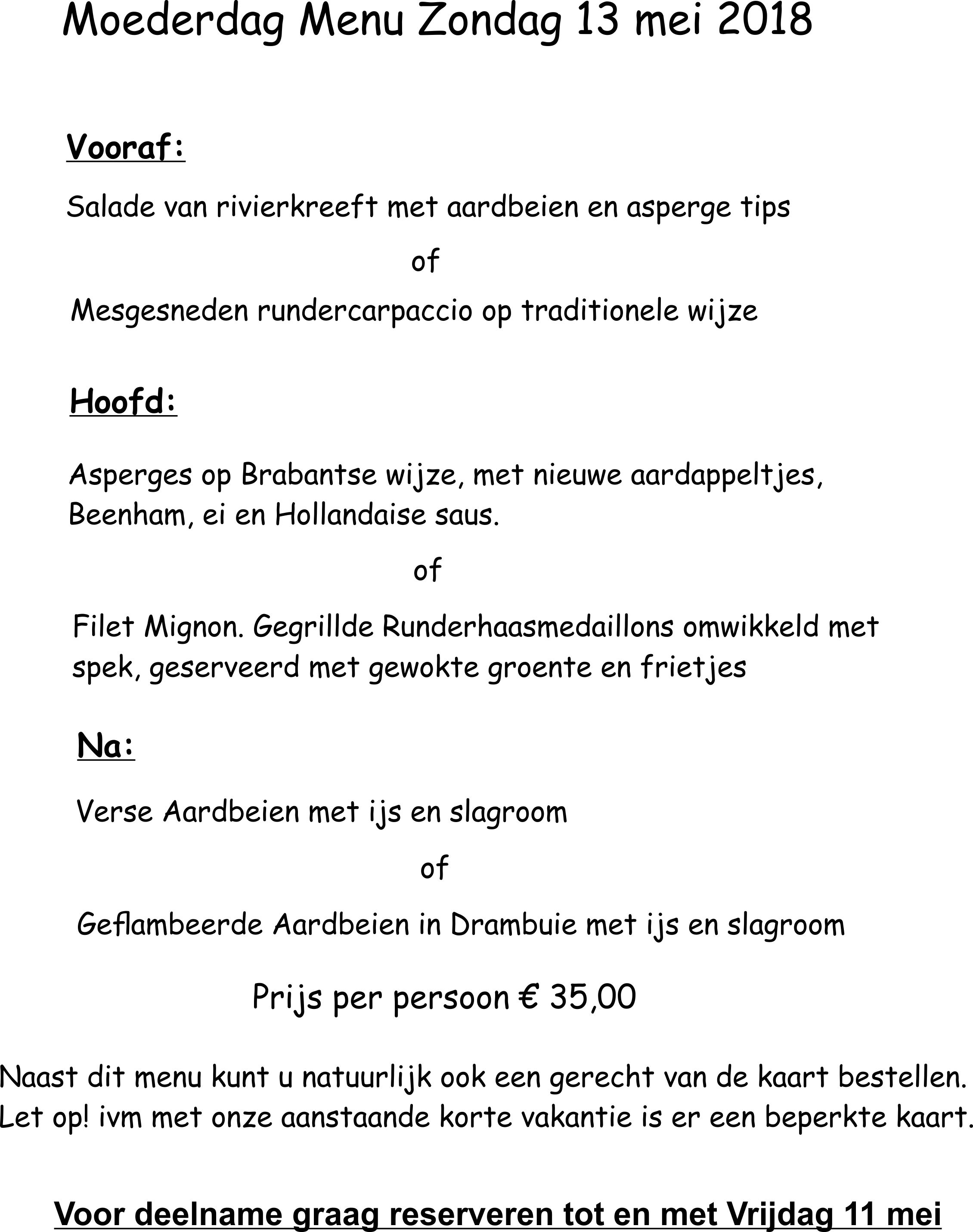 Speciaal voor moederdag op 13 mei a.s. hebben wij een keuze menu samengesteld. De prijs hiervoor bedraagt 35,00 euro per persoon.